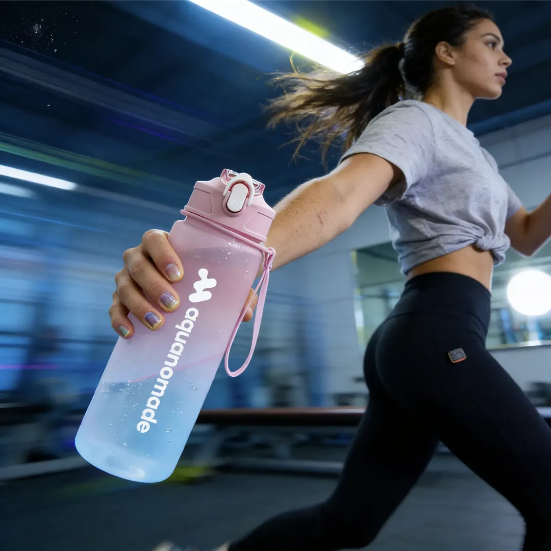 La gourde sport femme 750 ml Aquanomade prouve qu'on peut être colorée et sérieuse. Son bouchon flip-top avec paille intégrée te permet de boire d'une seule main — en plein cours de yoga, entre deux exercices de renfo ou sur le trajet du boulot. Pas besoin de dévisser, pas besoin de s'arrêter.
